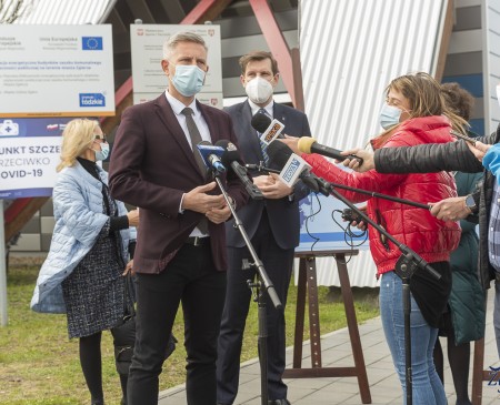Na zdjęciach poniżej wyposażenie puntu szczepień, wizytacja Prezydenta Miasta Zgierza i dyrektor MZPR, konferencja prasowa przed budynkiem MOSiR z udziałem Tobiasza Bocheńskiego (Wojewody Łódzkiego), pierwsze szczepienia.