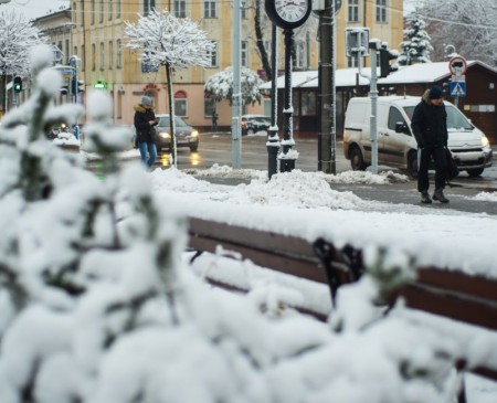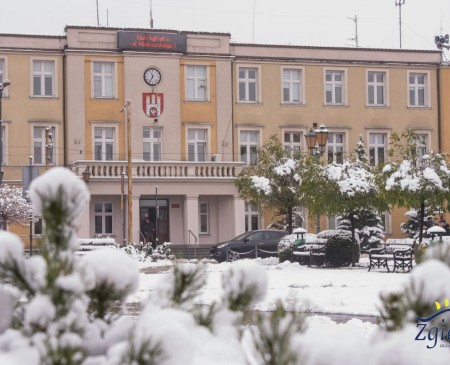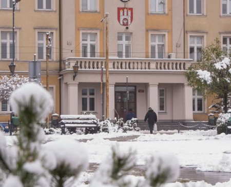 Zimowy widok Placu Kilińskiego, Parku Miejskiego im. Tadeusza Kościuszki oraz pl. Jana Pawła II. Subtelne piękno zaśnieżonego krajobrazu i drzew pokrytych białą pierzynką.