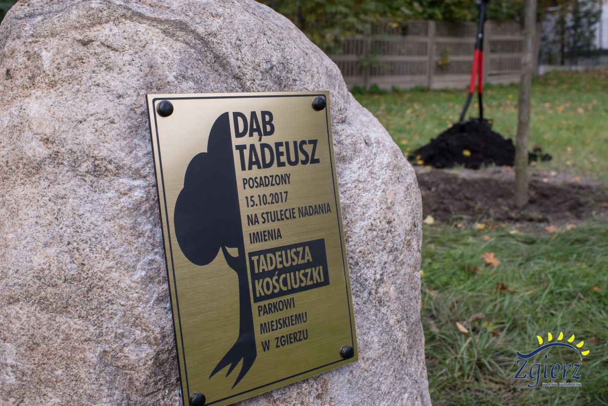 Kamień z pamiątkową tabliczką "Dąb Tadeusz"