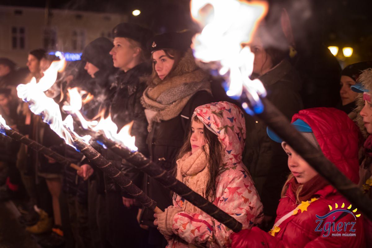 Zapalone pochodnie trzymają harcerze, dzieci i młodzież