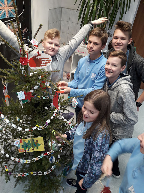 Uczniowie i ubrana choinka