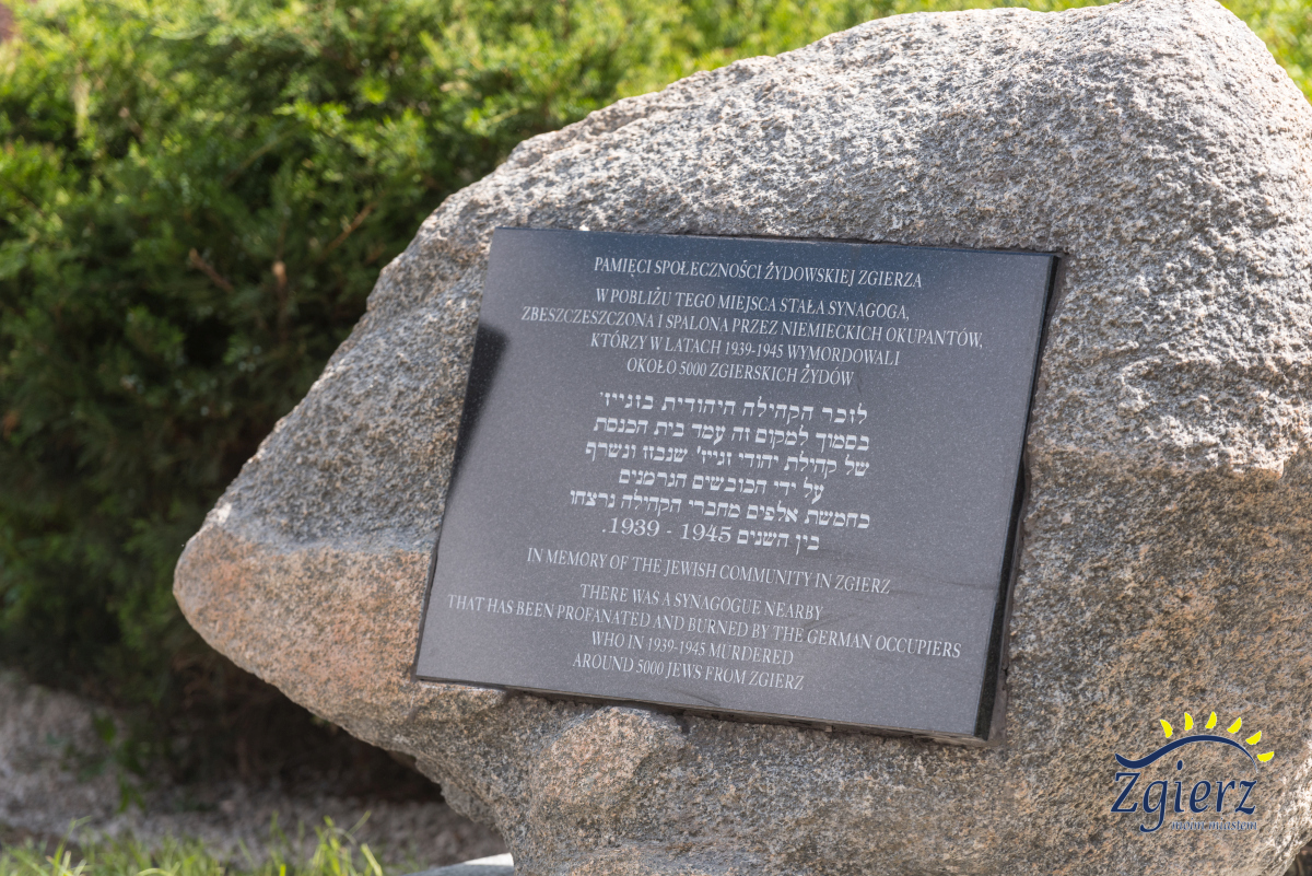 "Kamień Pamięci" z tablicą upamiętniającą spaloną synagogę