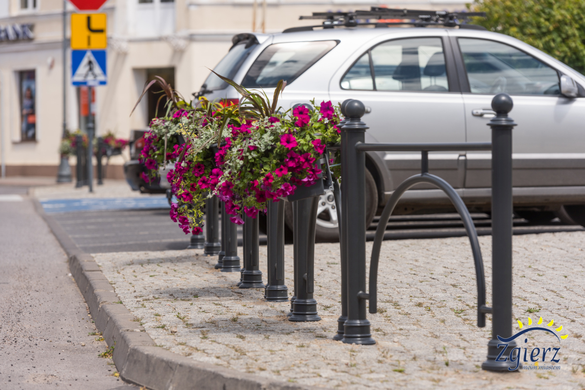 Ozdobne barierki ze skrzynkami kwitnących kwiatów