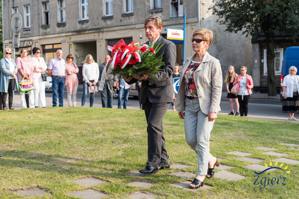 Składanie kwiatów przy kamieniu węgielnym pomnika Wolności i Niepodległości w Zgierzu