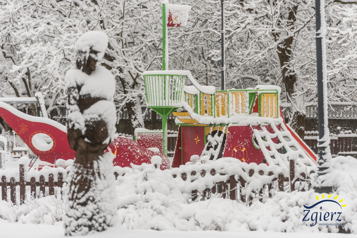 Zaśnieżony plac zabaw w parku miejskim