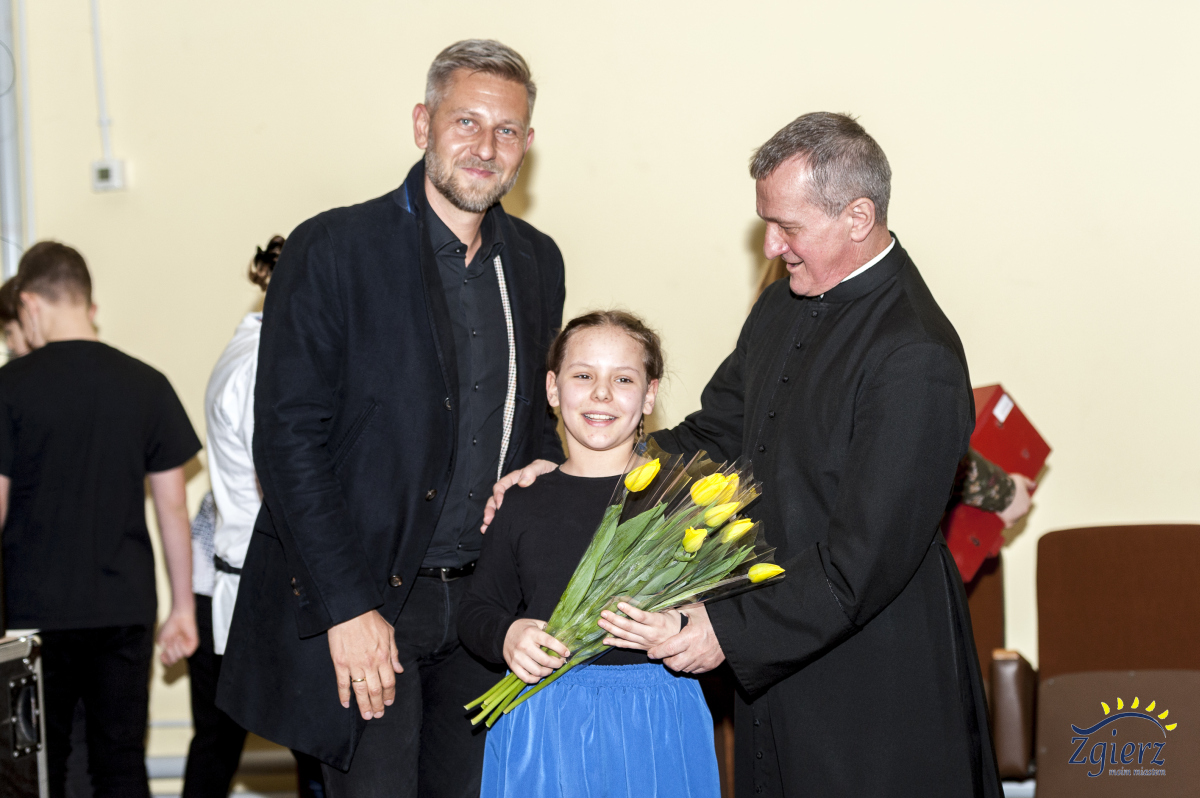 Od lewej: Przemysław Staniszewski (Prezydent Miasta Zgierza), Zuzia Ciesielska, ks. Andrzej Chmiele