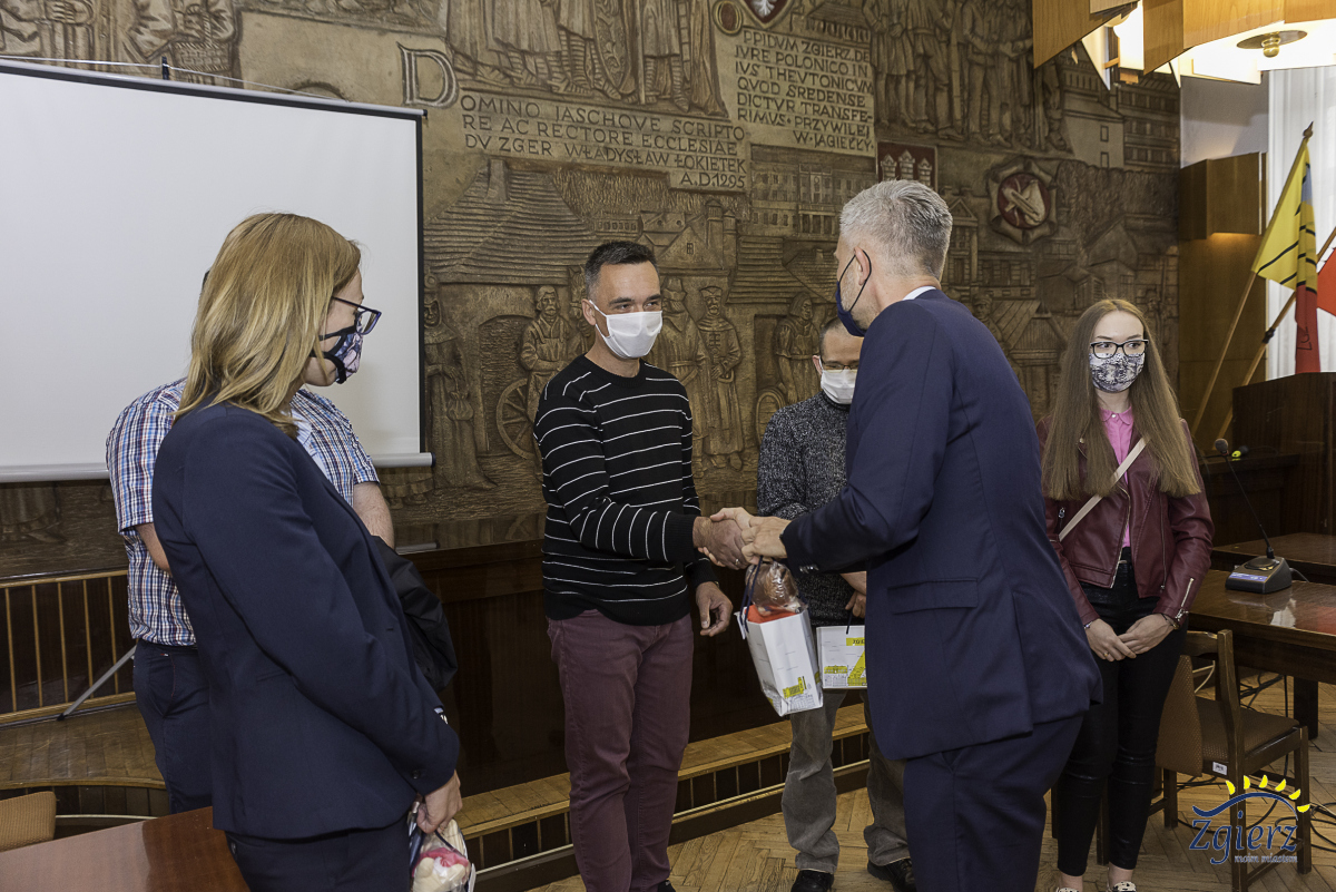 Prezydent Miasta Zgierza wręcza upominki laureatom konkursu