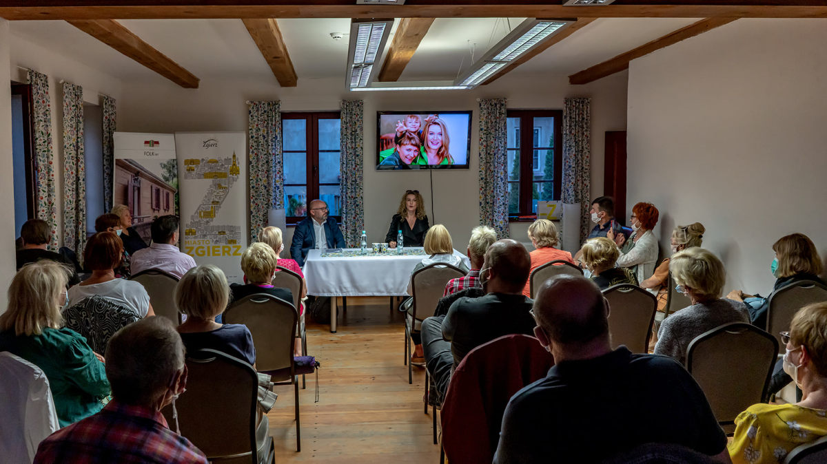 Na pierwszym planie publiczność uczestnicząca w spotkaniu, z tyłu sali za stołem siedzi Joanna Trzepiecińska i Jakub Niedziela