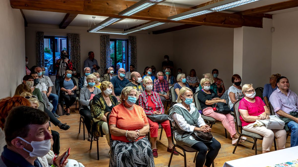 Na krzesełkach siedzi publiczność uczestnicząca w spotkaniu