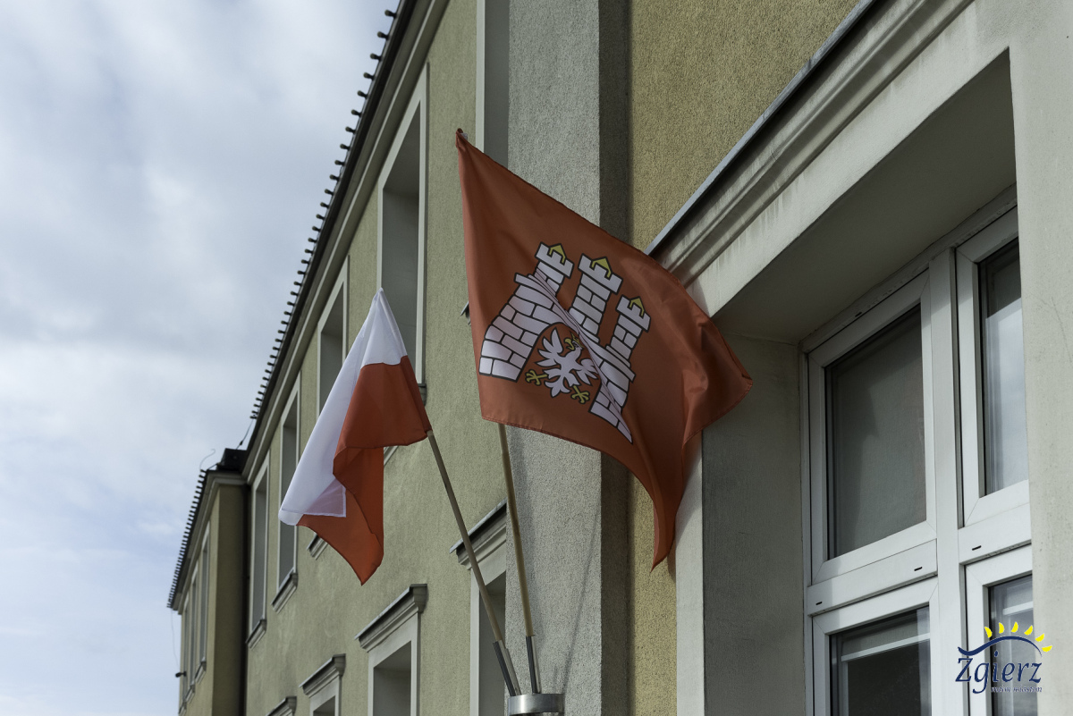 Flaga Polski i nowa flaga Zgierza przy ścianie budynku urzędu