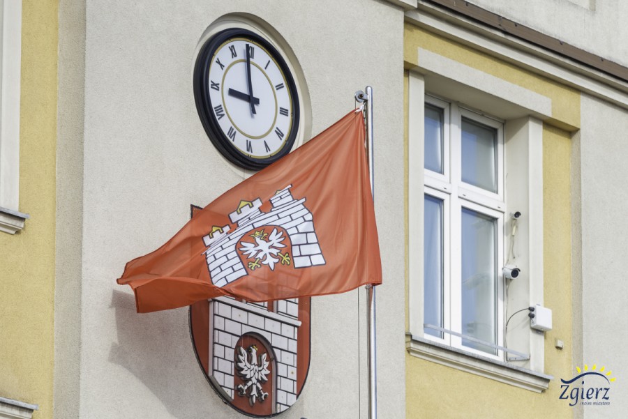 Nowa flaga Zgierza na maszcie na tle frontu budynku urzędu
