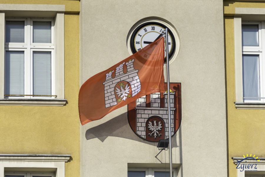Nowa flaga Zgierza na maszcie na tle frontu budynku urzędu