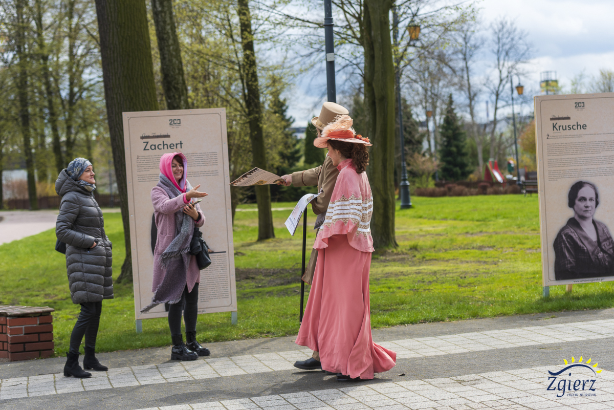 Postacie w strojach z epoki rozdają ulotki "200 lat Umowy Zgierskiej" oraz okolicznościo