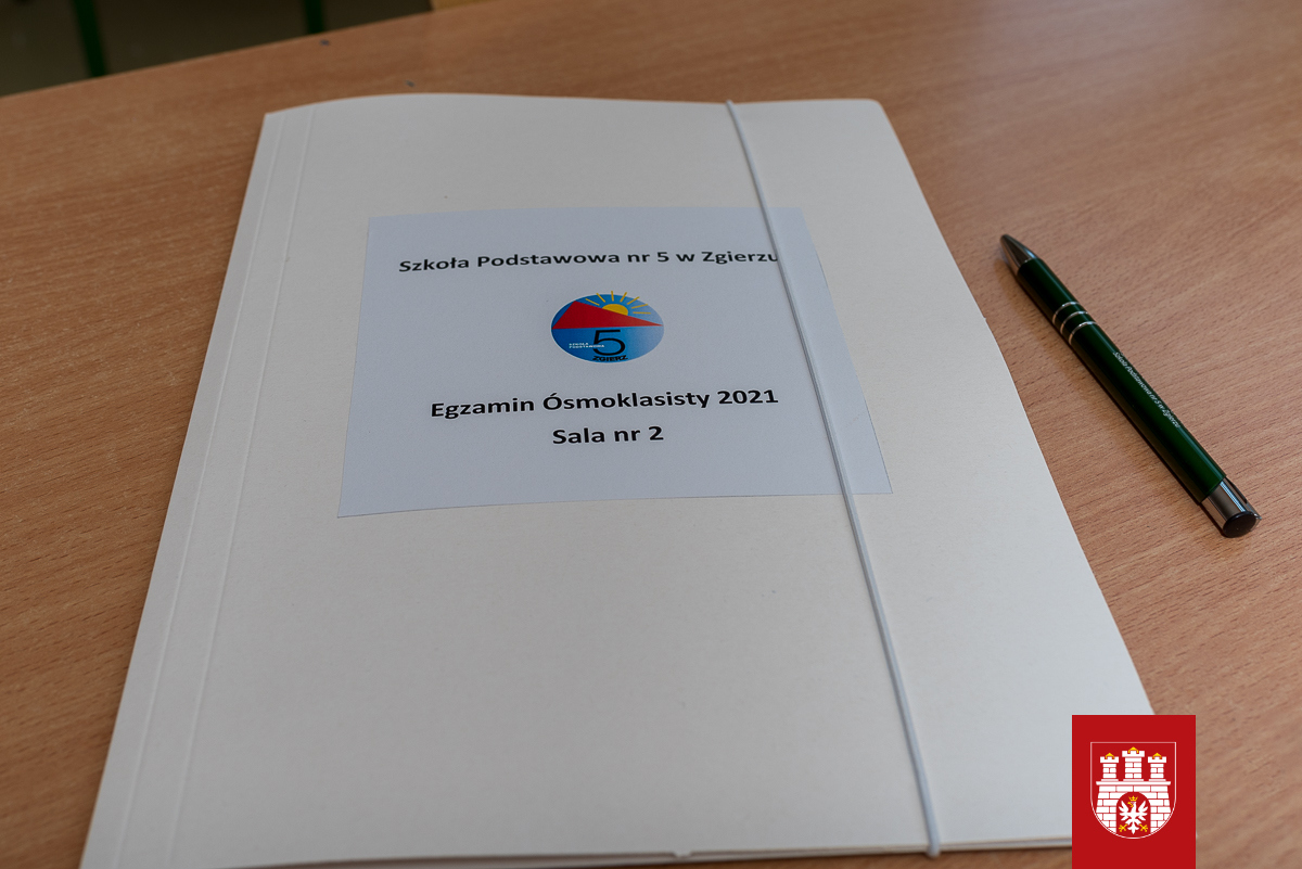 Teczka papierowa z napisem "Szkoła Podstawowa nr 5 w Zgierzu Egzamin Ósmoklasisty 2021 Sala n
