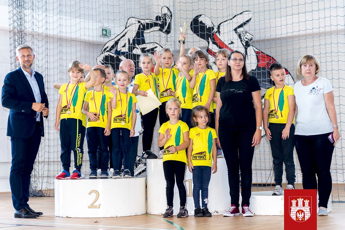 Na podium przedszkolaki z Prezydentem Miasta Zgierza, dyrektorem MOSiR i opiekunami