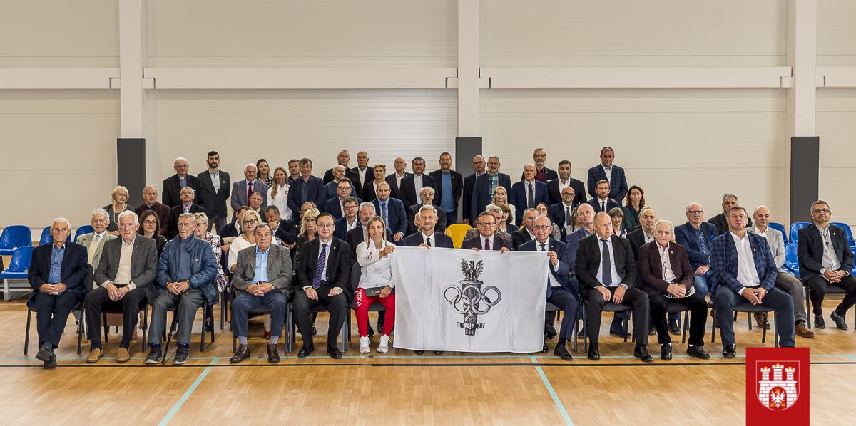 zbiorowe zdjęcie uczestników obchodów Dnia Olimpijczyka w zgierskiej hali MOSiR