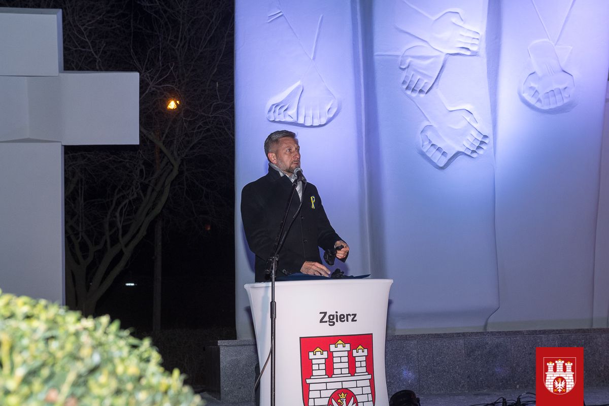 przed pomnikiem Stu Straconych przemawia Przemysław Staniszewski (Prezydent Miasta Zgierza)