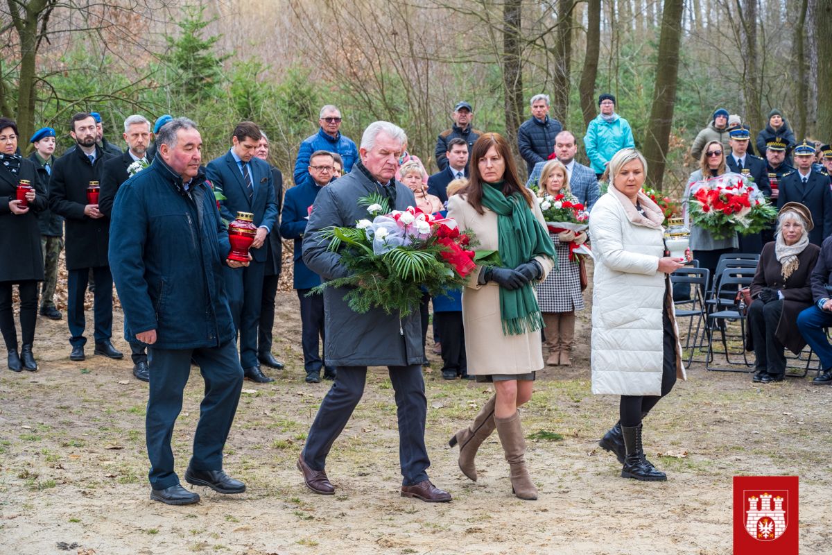 składanie kwiatów i zapalenia zniczy przy mogile Stu Straconych w Lesie Lućmierskim