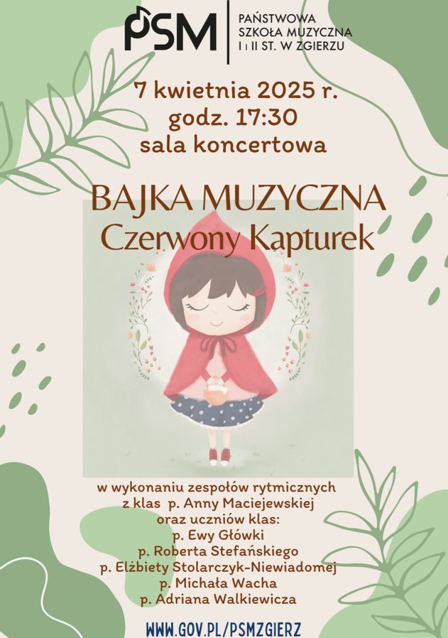 • 7 kwietnia 2025 r. o godz. 17:30 - Bajka Muzyczna "Czerwony Kapturek" - wystąpią zespoły rytmiczne oraz uczniowie klas naszych nauczycieli.