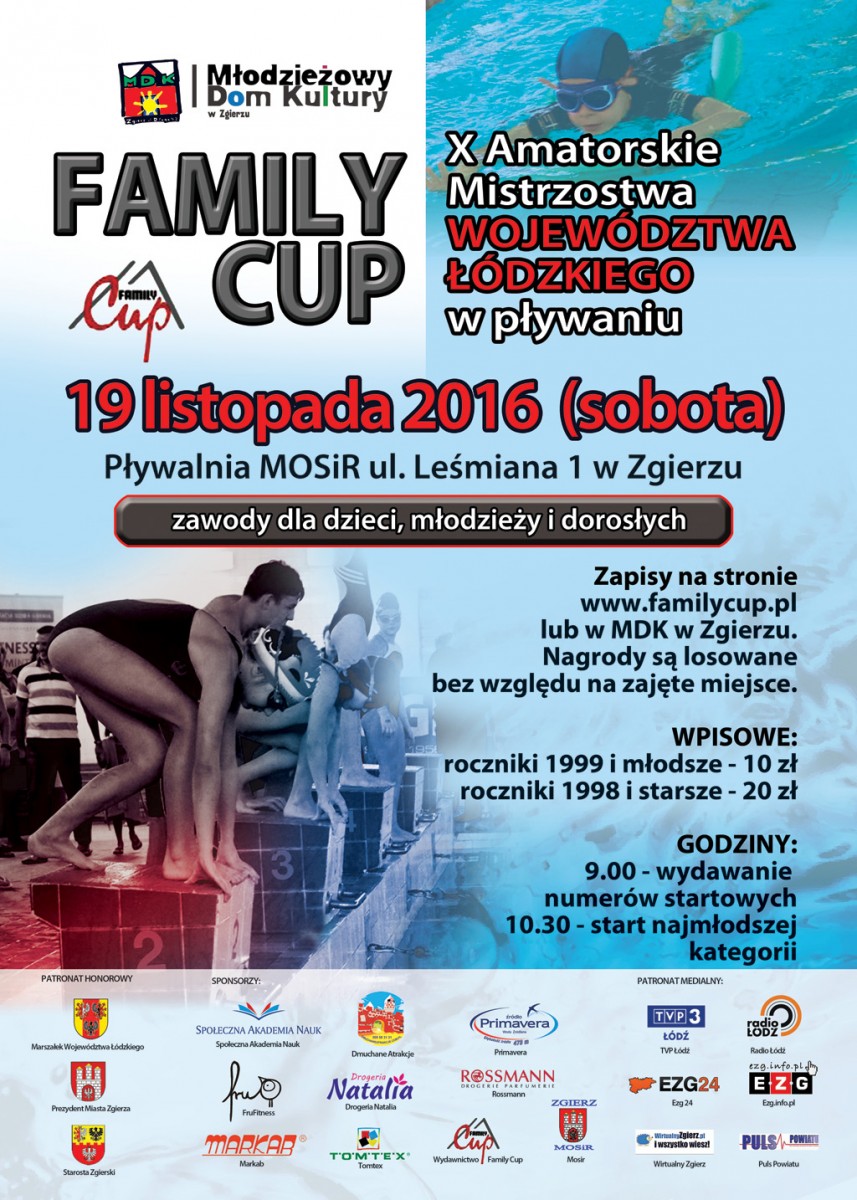Młodzieżowy Dom Kultury w Zgierzu, we współpracy ze Stowarzyszeniem Kameleon i Miejskim Ośrodkiem Sportu i Rekreacji w Zgierzu, już po raz dziesiąty organizuje Amatorskie Mistrzostwa Województwa Łódzkiego w Pływaniu Family Cup’16.