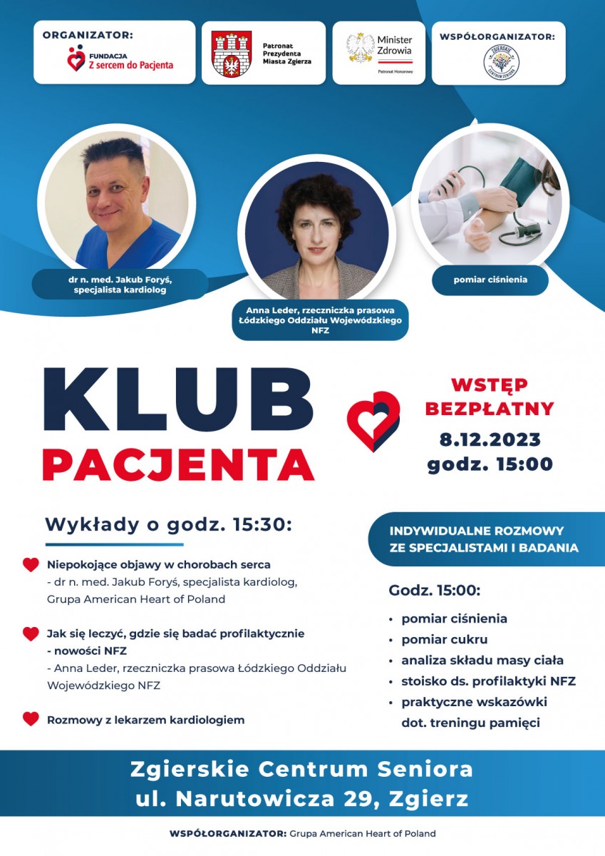 Fundacja "Z sercem do pacjenta" organizuje prelekcję w ramach Klubu Pacjenta - wydarzenie obejmować będzie zagadnienia związane z chorobami układu krążenia oraz profilaktyką zdrowia.