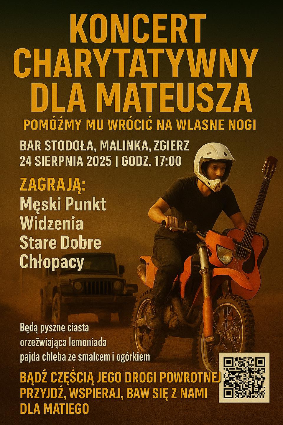 W barze „Stodoła” na Malince odbędzie się wyjątkowe wydarzenie - koncert charytatywny dla Mateusza. To spotkanie, które łączy muzykę, wspólnotę i ogromne serce, ma jeden cel: pomóc w dalszej walce o zdrowie i sprawność młodego chłopaka, który zmaga się dziś z trudnymi konsekwencjami poważnego wypadku komunikacyjnego.