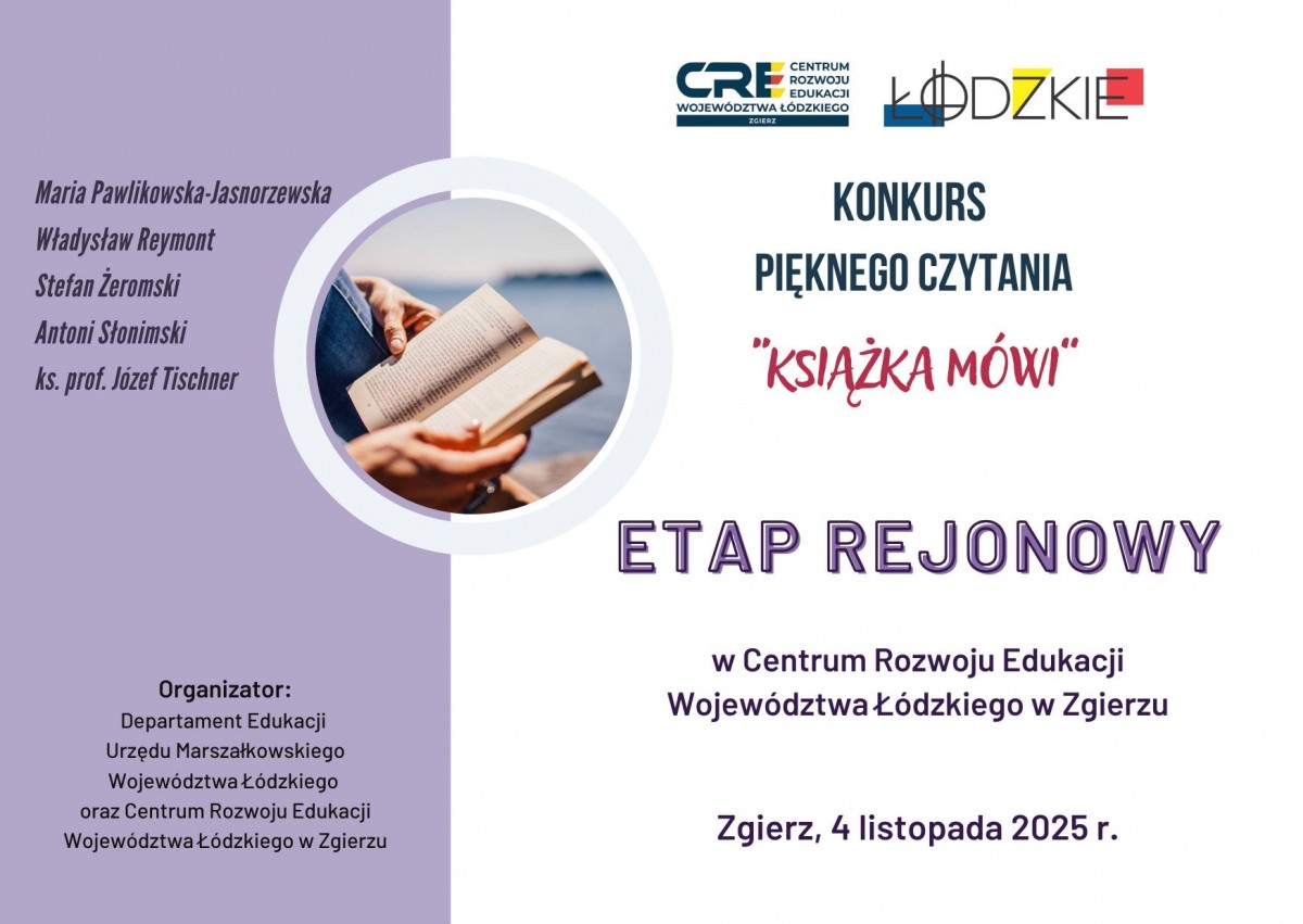 Serdecznie zapraszamy uczestników oraz opiekunów na etap rejonowy konkursu "Książka Mówi", który odbędzie się 4 listopada 2025 r. w Centrum Rozwoju Edukacji Województwa Łódzkiego w Zgierzu.