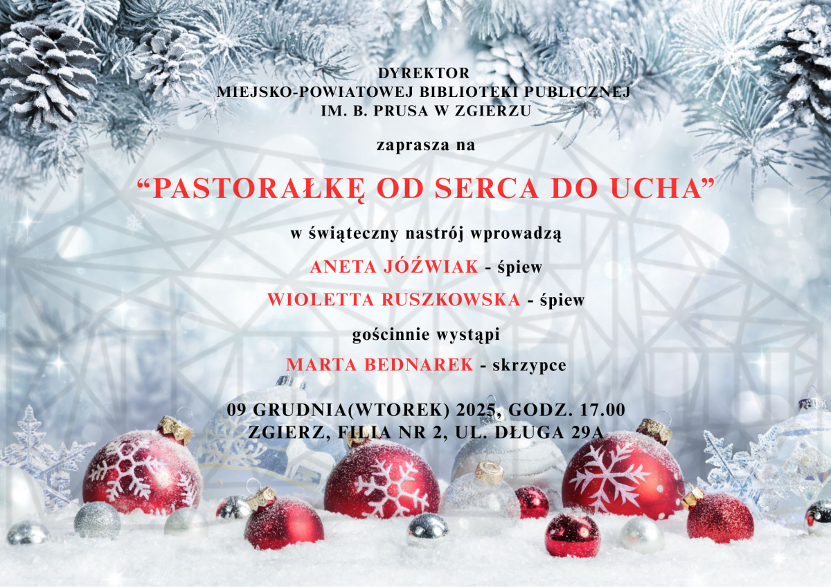 Szukasz chwili wytchnienia w grudniowy wtorek? Miejsko-Powiatowa Biblioteka Publiczna w Zgierzu (Filia nr 2) zaprasza na nastrojowy koncert "Pastorałka od serca do ucha". O ciepłą, świąteczną atmosferę zadbają wokalistki Aneta Jóźwiak i Wioletta Ruszkowska, a akompaniament skrzypcowy zapewni Marta Bednarek.