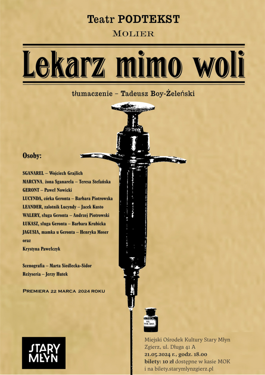 "Lekarz mimo woli” to jedno z najbardziej znanych dzieł Moliera, które w zabawny sposób ukazuje ludzkie zachowania i postawy. Sztuka bawi się konwencją komedii charakterów, gdzie każda postać reprezentuje różne aspekty ludzkiej natury. "Lekarz mimo woli" nie tylko bawi swoją humorystyczną akcją, ale również skłania do refleksji nad ludzkimi słabościami i tendencją do ulegania własnym przekonaniom i lękom.