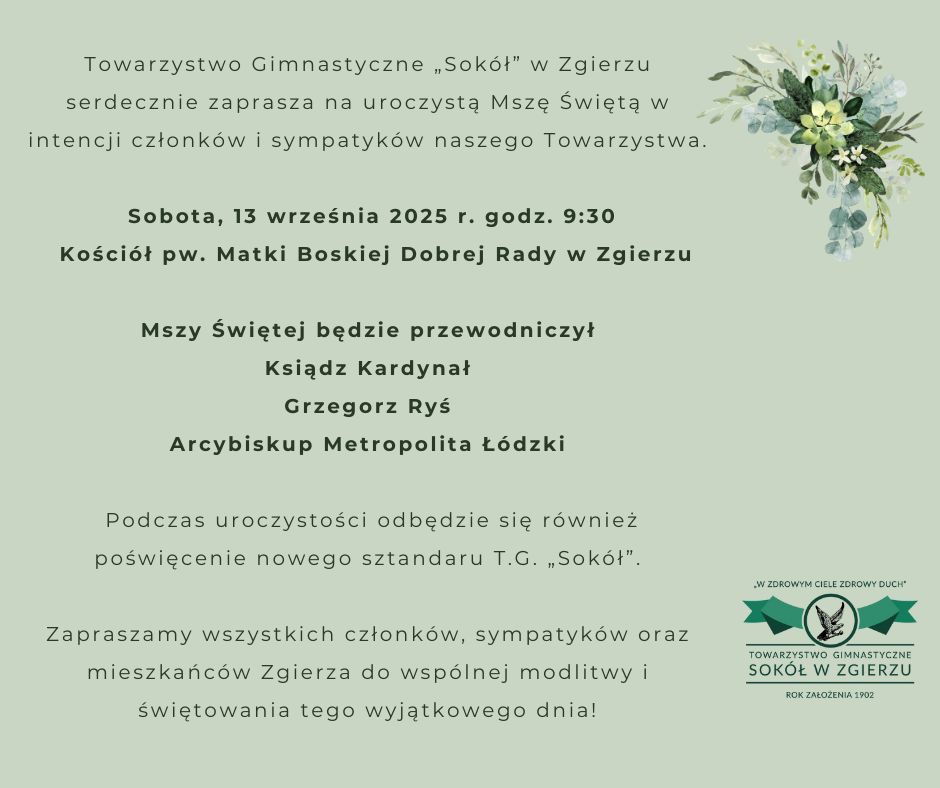 Mszy Świętej przewodniczyć będzie Ks. Kardynał Grzegorz Ryś, Arcybiskup Metropolita Łódzki, a podczas uroczystości poświęcony zostanie nowy sztandar Towarzystwa Gimnastycznego SOKÓŁ Zgierz