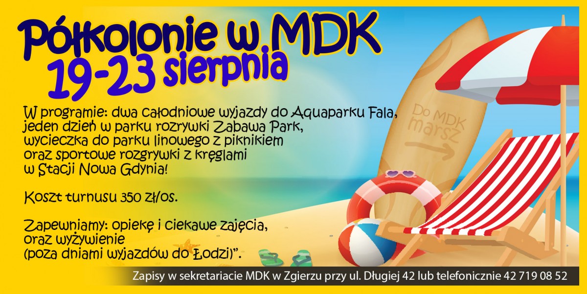 • 19-23 sierpnia w godz. 8:00-17:00 - Półkolonie (Facebook) - w programie: dwie całodniowe autokarowe wycieczki do Aquaparku Fala w Łodzi, jeden dzień w parku rozrywki Zabawa Park, wycieczka do parku linowego z piknikiem, sportowe rozgrywki z kręglami w Stacji Nowa Gdynia - plakat