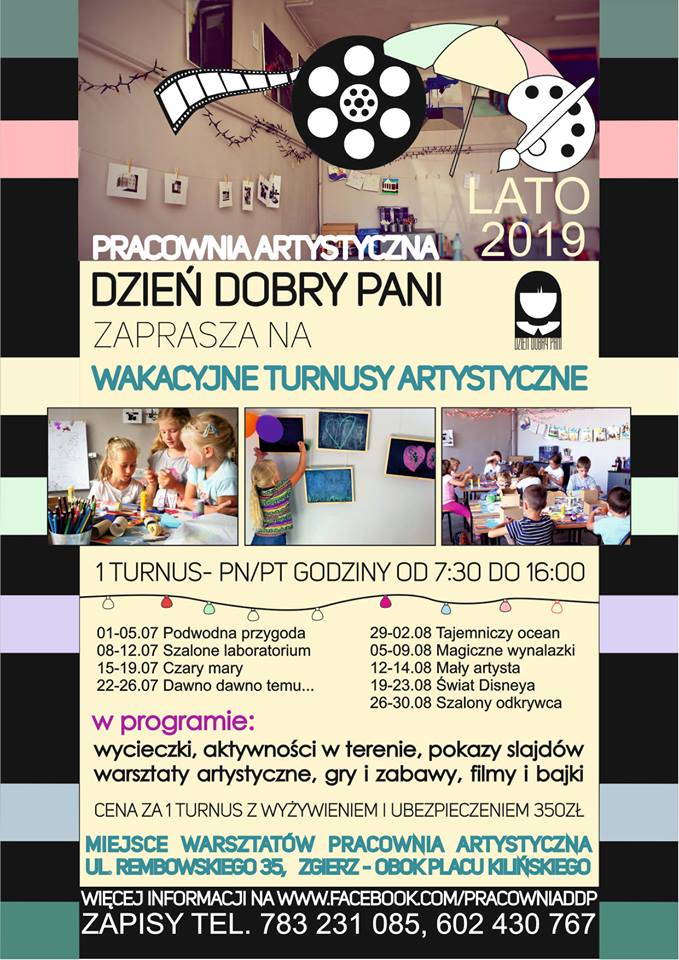 Wakacyjne turnusy artystyczne dla dzieci (turnusy tygodniowe od poniedziałku do piątku w godz. 7:30-16:00) - w programie: wycieczki, aktywności w terenie, pokazy slajdów, warsztaty artystyczne, gry i zabawy, filmy i bajki.