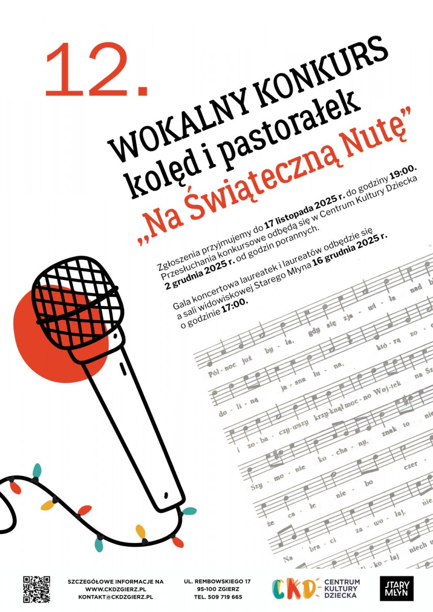 Święta kojarzą nam się z bliskimi, bliscy z radością, a radość... ze wspólnym kolędowaniem! Polskie kolędy i pastorałki to przede wszystkim nadal aktualne opowieści o nadziei i długo wyczekiwanym szczęściu, które zaklęte w dźwiękach najpiękniejszych melodii, trafiają prosto do serc słuchaczy. Dlatego, już po raz dwunasty, zapraszamy Was gorąco do wspólnego celebrowania tej magicznej tradycji podczas kolejnej edycji Wokalnego konkurs kolęd i pastorałek "Na Świąteczną Nutę". Jest to fantastyczna okazja, aby podzielić się swoim talentem, wystąpić przed publicznością oraz nawiązać nowe artystyczne znajomości! Zaproszenie kierujemy do uczestników oraz uczestniczek od 4 do 17 roku życia, w kategoriach: Soliści, Duety oraz Zespoły. Zgłoszenia mogą być dokonywane przez placówki, organizacje oraz indywidualnie przez rodzica lub opiekuna prawnego.
